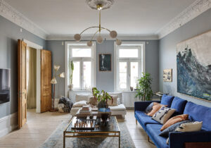 Винтажные детали стали объединяющим элементом в дизайне интерьеров этой просторной квартиры в историческом доме в Стокгольме. Гостиная оформлена в свежих оттенках синего, а главным цветовым акцентом всего дома является, безусловно, ярко-синий диван. В этом интерьере имеются уникальные двустворчатые двери из винтажного дерева — смотрятся они очень выразительно, а также добавляют приятных тёплых ноток. Цветовая гамма …