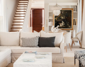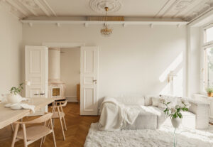 Красивый белый интерьер с лепниной и минималистичным декором (78 кв. м)