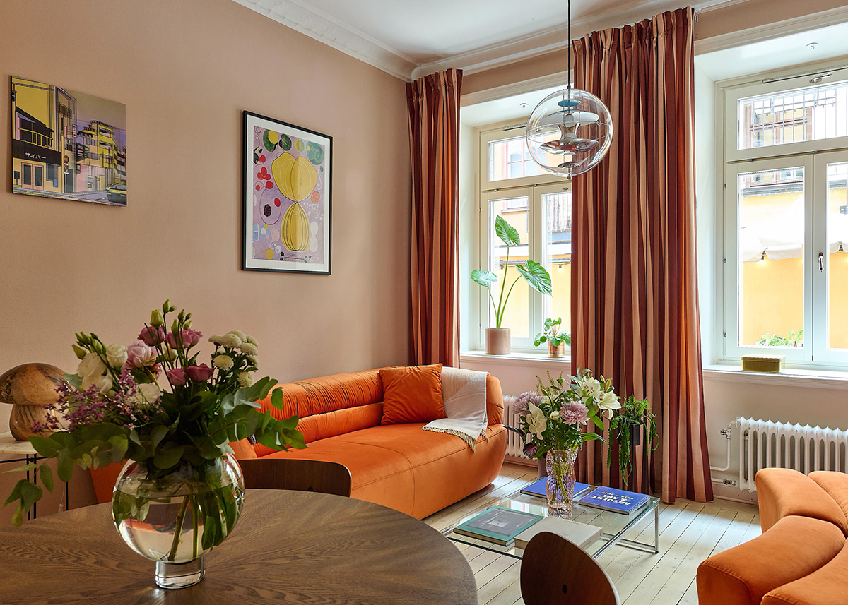 Скандинавские интерьеры могут быть не только серыми или белыми — эта квартира в Стокгольме получилась очень яркой и богатой на интересные фишки. Начнём с внутреннего пространства — здесь дизайнеры отлично поработали с цветом, ведь каждая комната оформлена в своей уникальной, при этому в необычной и смелой гамме. Особенно выделяется гостиная с рыжим диваном, розовыми стенами и абстрактными постерами. Но главная изюминка этой квартиры — просторная патио-терраса с мебелью и растениями, в которую можно попасть прямо из кухни. Это просто замечательное дополнительное пространство для отдыха и развлечений, особенно в теплое время года!