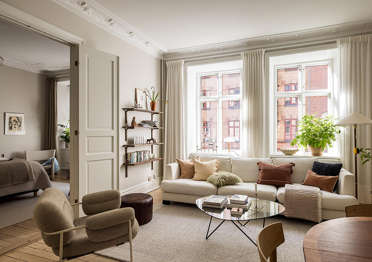 Интерьер этой шведской квартиры в бежевых тонах смотрится очень целостно и гармонично. В скандинавских интерьерах часто бывает, что одна или две комнаты «выпадают» из общей картины, но в этом случае каждый уголок получился красивым и привлекательным. Тема оттенков бежевого  прослеживается в оформлении каждой комнаты, а элегантные детали вне времени не только подчеркивают великолепие пространств с лепниной, но и стилистически объединяют все интерьеры квартиры. Уютно и со вкусом!