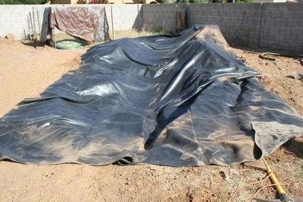 Далее в котлован расстилают пленку. Под нее желательно расстелить геотекстиль (самый дешевый — 600-700 рублей рулон). Этот нетканый материал предотвратит прорастание корней, а также более равномерно перераспределит нагрузку. Его укладывают и на края котлована, застилают бока и дно. Сверху уже — пленку.