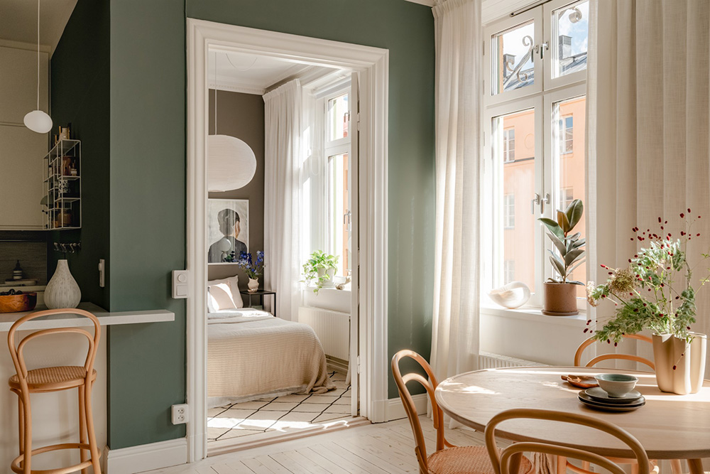 Красивые глубокие оттенки стен в дизайне небольшой двушки в Швеции (44 кв. м)