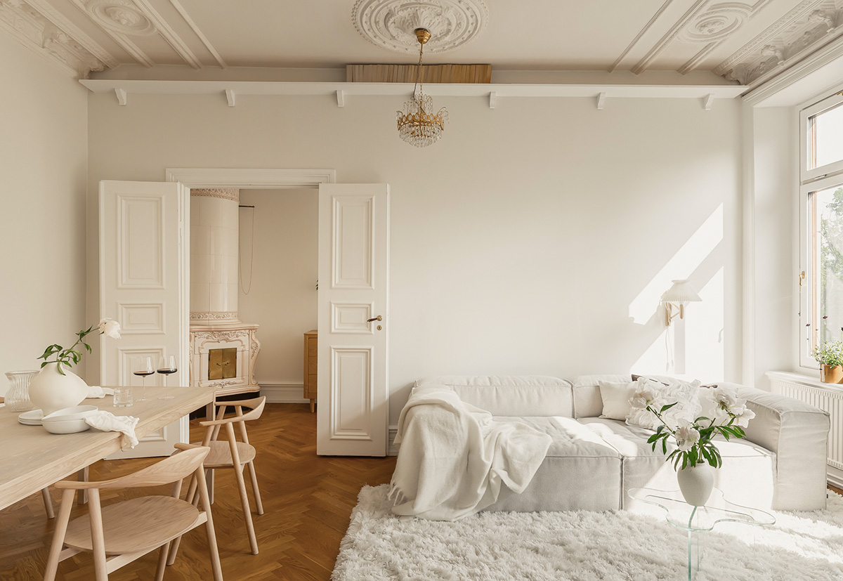 Как мы знаем, минималистичный дизайн лучше всего подходит для интерьеров с великолепным пространством, ведь архитектура обычно говорит сама за себя и не требует большого количества улучшений. Эта квартира в Гётеборге с белыми стенами и минимальным количеством декора — отличное тому подтверждение. Она находится в старом доме, поэтому комнаты характеризуются высокими потолками с изящной лепниной, красивыми окнами и французским паркетом. А ещё зелень за окном добавляет приятных ноток в атмосферу в доме. Enjoy!