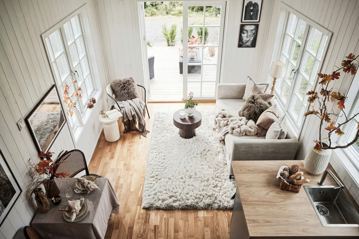 Площадь этого шведского коттеджа — немыслимые 24 кв. м, но внутри вы точно не чувствуете себя скованно или ограниченно. Пространство дома отлично спланировано, имеет большое количество естественного света, а спальня на антресоли ещё даёт нужный уровень приватности. Кроме этого, важной особенностью дома является окно в пол в гостиной, через которое можно попасть на собственную небольшую террасу. Прекрасный вариант для дачного домика!