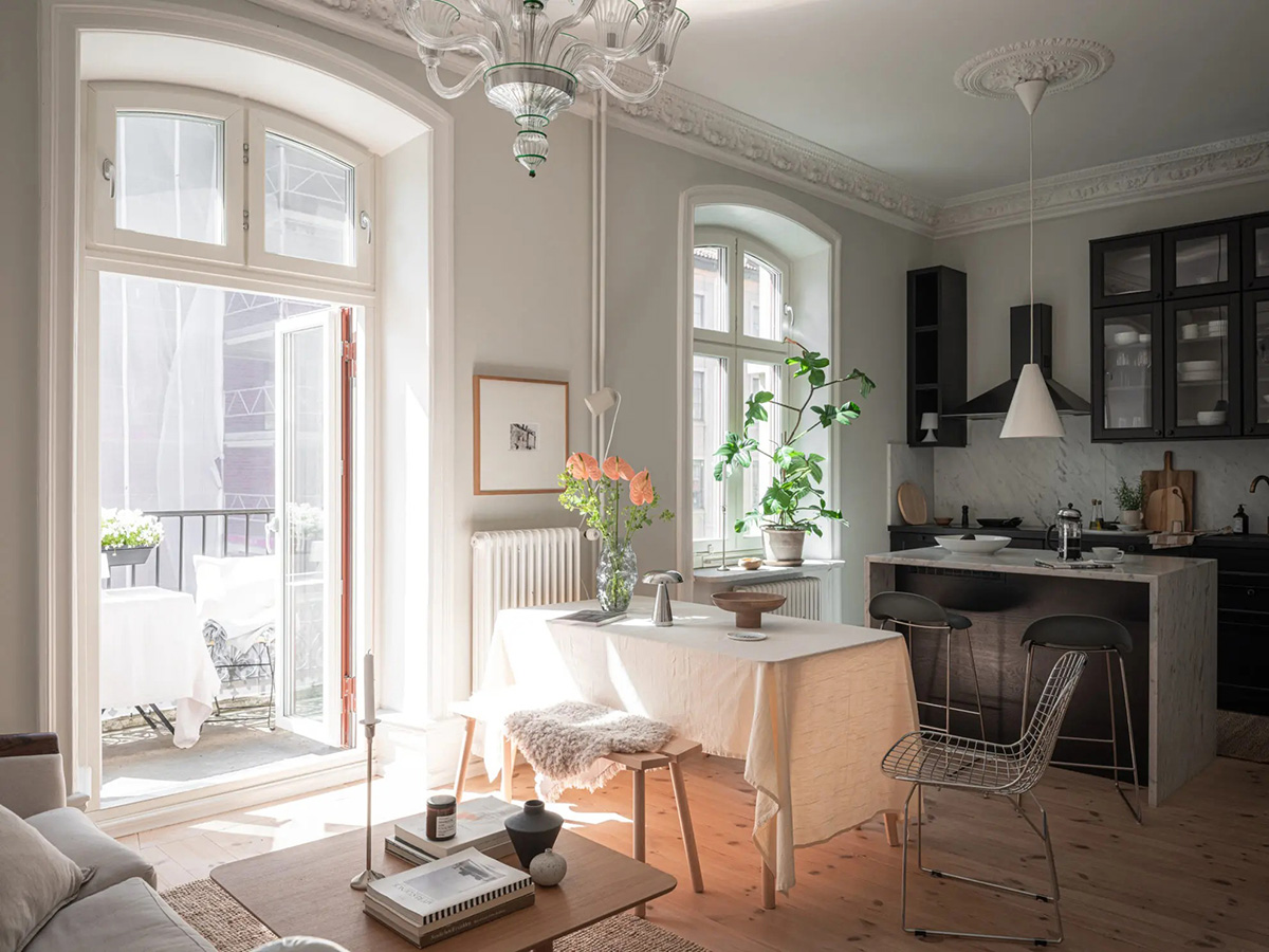 Небольшая, но с прекрасным пространством и видами на парк — эта квартира в Гётеборге выглядит очень приятно, несмотря на скромную площадь. Планировка здесь очень удобная — обе жилые комнаты имеют прекрасное естественное освещение и выходят окнами на небольшой парк. И это не считая роскошных высоких потолков с лепниной, арочных окон и открытой гостиной с балконом. Красота!