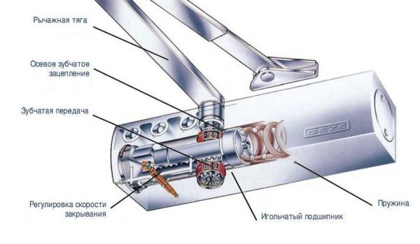 Основной элемент конструкции доводчик для двери — пружина, которая толкает рычаг. По способу передачи усилия от пружины к рычагу бывают устройства двух типов: