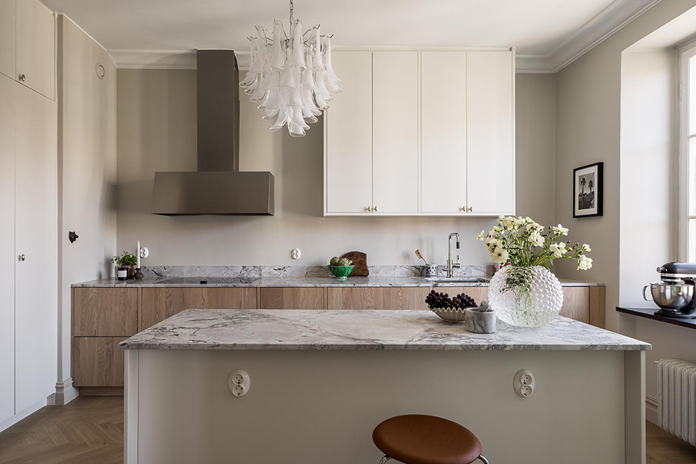 Минимализм в цветовой гамме и декоре — по такому принципу была оформлена эта квартира в модернистском доме в Гетеборге. Ввиду отсутствия классической лепнины и высоких потолков (строгая архитектура дома не предполагает элегантных деталей оформления), дизайнеры сделали акцент на стильной мебели и монохромной обстановке. Особенно понравилась кухня с лаконичными деревянными шкафчиками, красивой мраморной рабочей поверхностью и открытой вытяжкой. Enjoy!