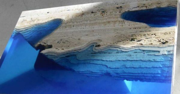 Используют гальку, натуральный или покрашенный гравий. Эти камни можно выкладывать довольно толстым слоем — смола все равно затечет в промежутки. Часто встречается в комбинации с древесиной. Кстати, если вы «промахнулись» с количеством эпоксидной смолы, можно в залитую смолу добавить камушки. Так можно добрать нужный уровень.