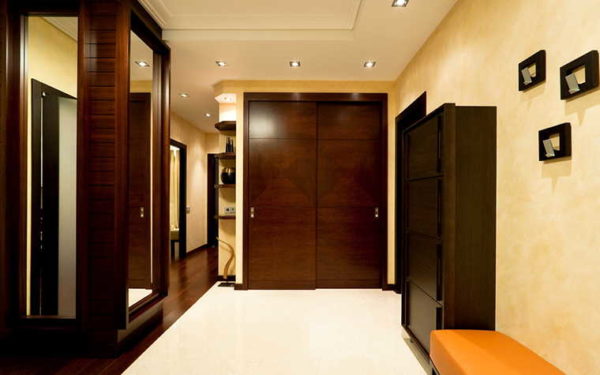 - Длинная вытянутая прихожая. Особый акцент делают на освещение стен. Светильники могут быть расположены на стенах или потолке, но свет от них должен быть направлен на верхнюю часть стен. Этот эффект поможет визуально помещение сделать шире. Еще больше эффект будет, если одна из длинных стен будет оформлена зеркалом, желательно, во всю стену.