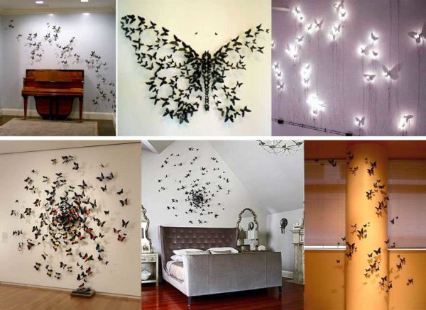 И несколько настенных композиций, в которых использованы бабочки для декора, сделанные из разных видов бумаги.
