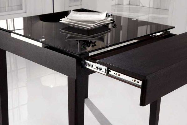 Есть раскладной стол для маленькой кухни из стекла с похожим принципом работы. Но устроено иначе. Рама стола сделана раздвижной, и по краям, под основной столешницей прячутся «добавочные элементы». Сначала раздвигается рама, затем раскладывается столешница.
